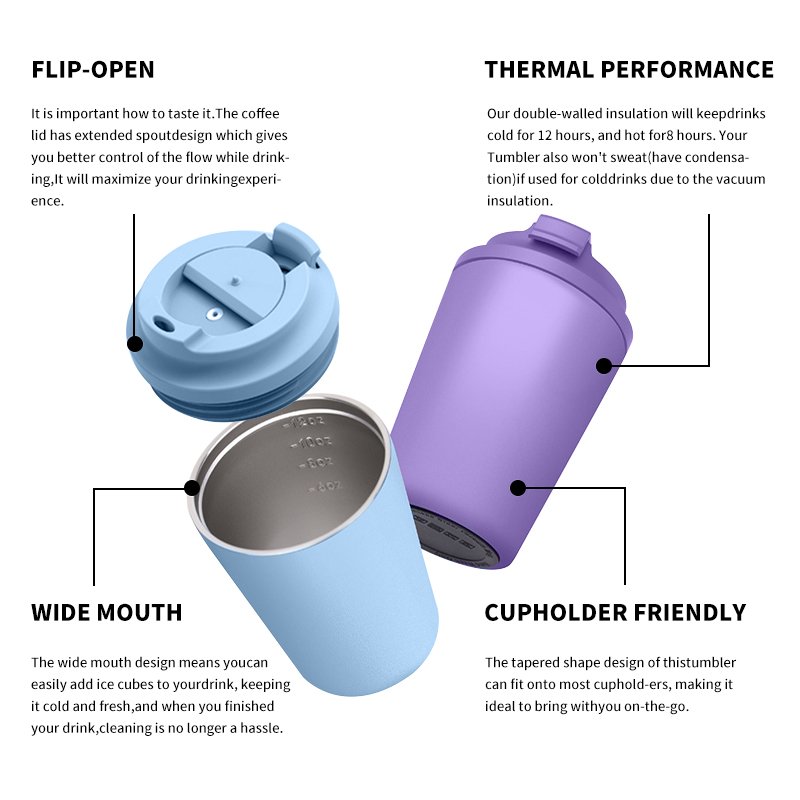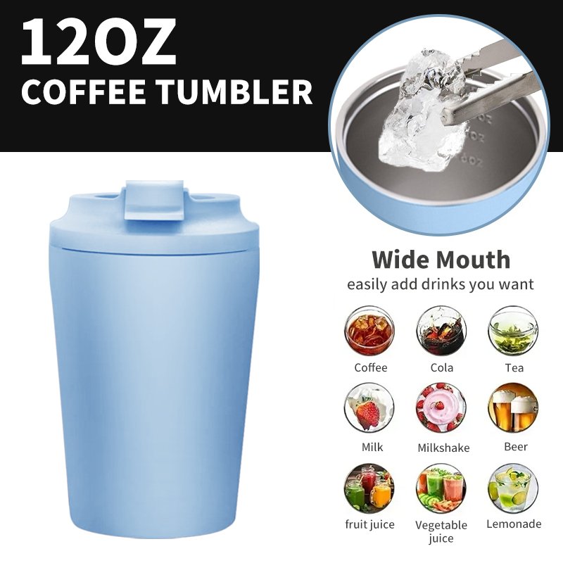 • eep warm and cool: 12oz coffee cups with double-layer vacuum insulation technology or other insulation materials have good heat and cold insulation performance. They can not only keep hot coffee hot for a long time, but also be used to hold iced coffee, cold drinks, etc., so that the drinks can stay cool for a long time, which is suitable for different seasons and different drinks.