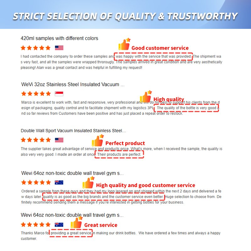 As a globally trusted insulated water bottle manufacturer with 16+ years of expertise, WEVI combines cutting-edge aerospace-grade 304 stainless steel technology and FDA-certified eco-friendly coatings across ISO-compliant factories in China. Our vacuum-insulated bottles deliver 24-hour temperature retention with leak-proof durability, empowering 200+ brands and Amazon sellers to achieve 300% YOY growth through scalable OEM/ODM solutions, custom packaging, and hassle-free global logistics. With a monthly capacity of 800,000 units, LFGB/SGS certifications, and dedicated support from product design to doorstep delivery, we turn startups into market leaders.